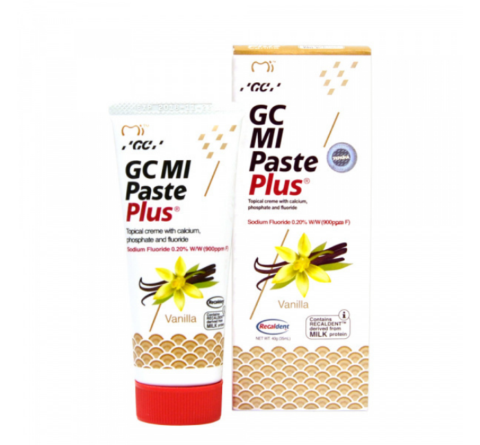 Подібно до Tooth Mouse гель-крем MI PASTE PLUS розроблений із застосуванням технології RECALDENT TM (Казеїн Фосфопептід – Аморфний Кальцій Фосфат). MI PASTE PLUS є видатним препаратом для ремінералізації та фторування тканин зуба. Це максимально природний і водночас високоефективний спосіб відновлення початкових уражень емалі та дентину карієсом, модифікований додаванням 900 ppm унікальної запатентованої форми фториду.