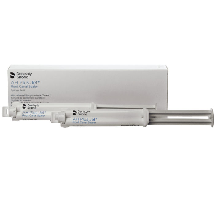 AH Plus Jet – двокомпонентний силер типу паста/паста на основі епоксидно-амідної смоли. Застосовується для тривалого пломбування кореневих каналів, пломбування основ каналів за повторної санації. Зручний у застосуванні, тому що випускається у шприцах для змішування, безпосереднього інтраорального застосування. Цей матеріал має відмінну рентгеноконтрастність, відрізняється тривалою герметизацією, здатністю до самоадгезії. Упаковка: змішувальний шприц 15 м