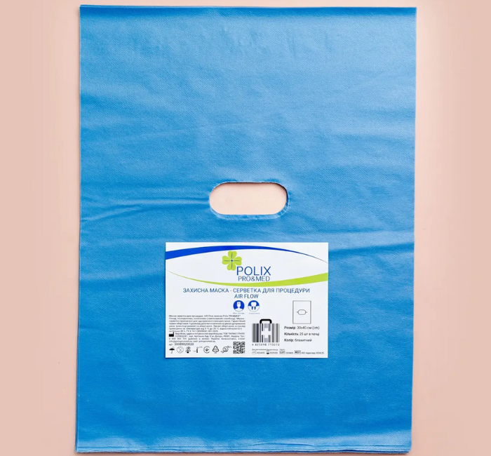 Запобігає попаданню бризок води під час процедури AIR Flow. Має отвір для ротової порожнини. Маска-серветка сприяє комфорту пацієнта під час стоматологічних маніпуляцій. Стійка до розриву, ніжна та приємна на дотик, без запаху, гіпоалергенна.