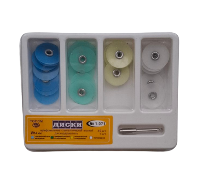 Диски шліфувальні із металевою втулкою, діаметр 14 мм, 40 шт. для зняття надлишків матеріалу (№1.731(12)) 10 шт. для попереднього шліфування (№1.732(12)) 10 шт. для остаточного шліфування (№1.733(12)) 10 шт. для полірування (№1.734(12)) 10 шт. дискоутримувач № 1.121 1 шт.